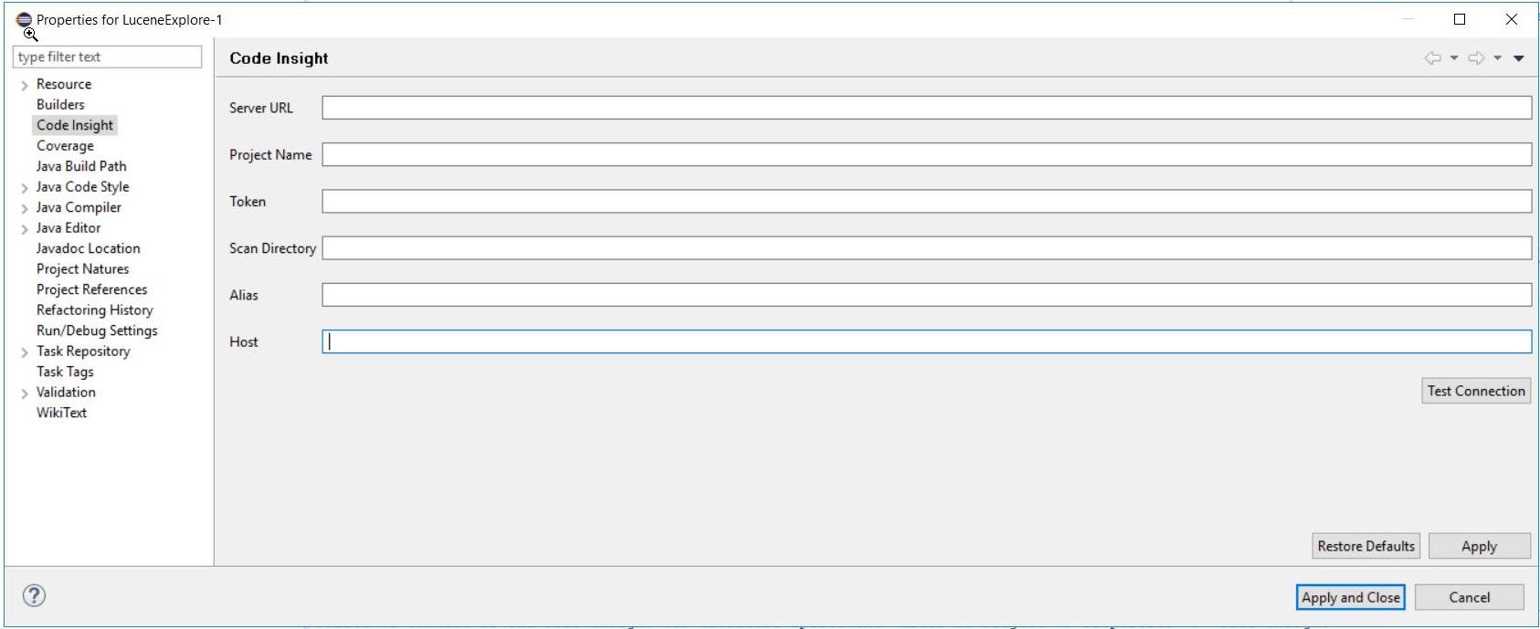 2. On the Properties window for your project, select Code Insight in the left pane to display the properties needed for a Code Insight scan.