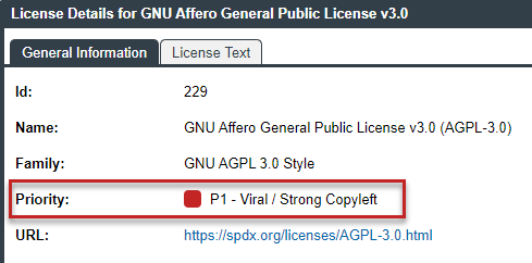 | P1 | Viral/Strong Copyleft | Usually, P1 licenses require immediate attention due to the possibility of tainting proprietary application code, an issue that can have significant business impact. | |